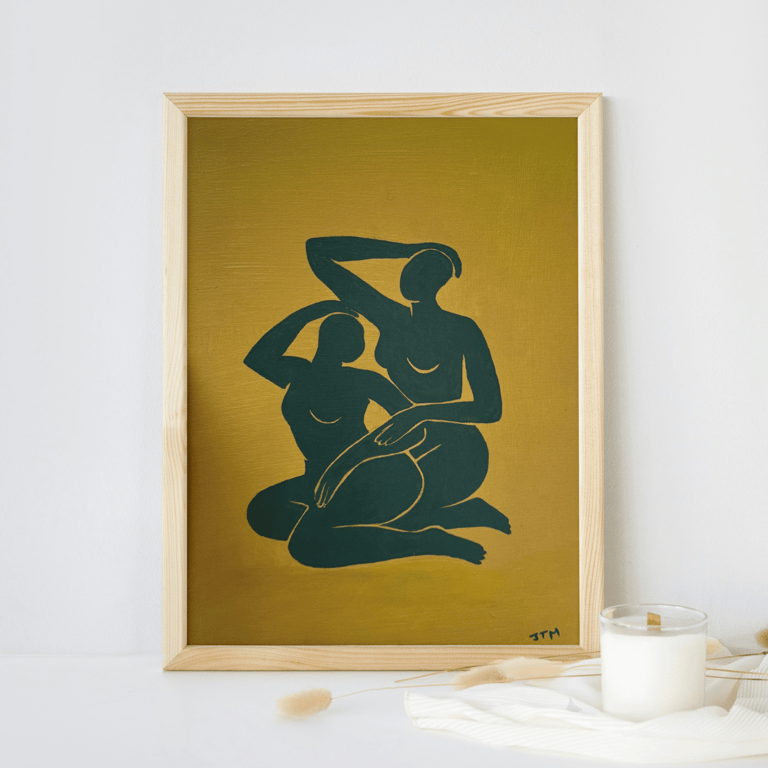 The lines are fluid and organic, echoing the way closeness between women often flows without needing explanation. I worked with a palette of deep umbers, soft ochres, and muted reds, earth tones that feel rooted, ancestral, and grounding. They speak to the soil of connection, to where we come from, and to the emotional depth of rest and reliance.
